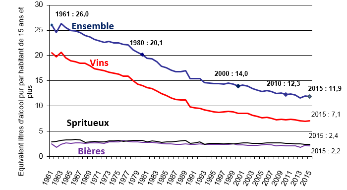 depuis 1960 jusqu'à nos jours passant de 26 à environ 12 litres d'alcool pur par an et
