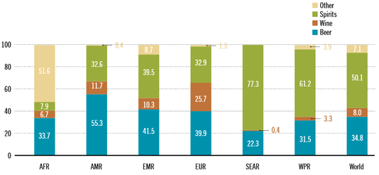 On remarque cependant que l'Amérique consomme majoritairement de la bière (56,3%) et que l'Asie du Sud-Est boit massivement des boissons spiritueuses (77,3%). L'Europe et plus particulièrement la France, boit quant à elle beaucoup plus de vin que le reste du monde.